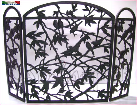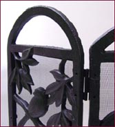 Pare-étincelles ou pare-feu en fonte à 3 portes avec motif d’oiseaux, de couleur noire.