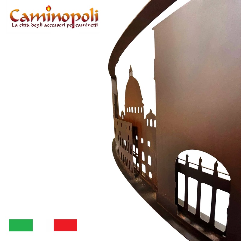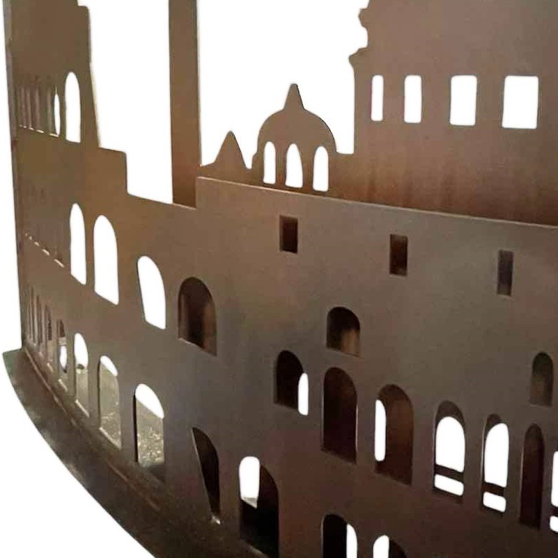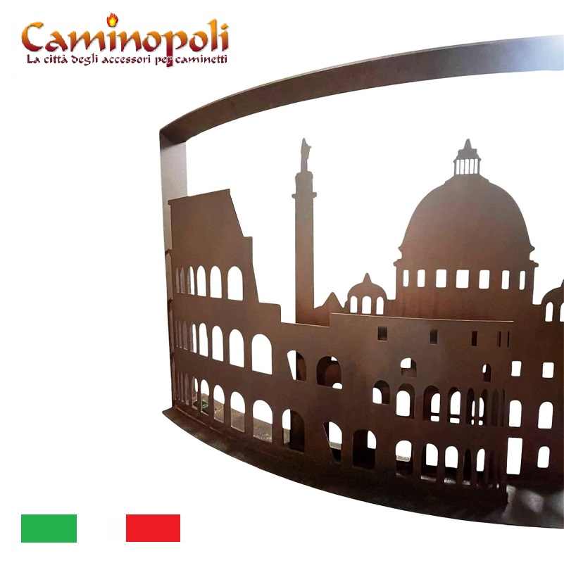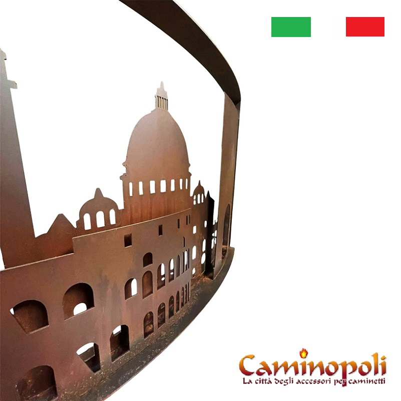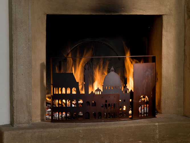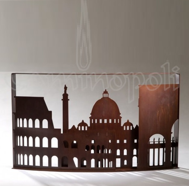 Le nom Roma DCCCXVII fait référence à l’incendie historique dévastateur qui a brûlé la Rome impériale sous le règne de l’empereur Néron en 64 après J.-C. Le pare-feu reconstitue en fait, en acier découpé au laser, la ligne d’horizon de la ville de Rome, reproduisant un jeu d’ombres et de lumières (il faut bien le dire) à l’éclat sinistre.