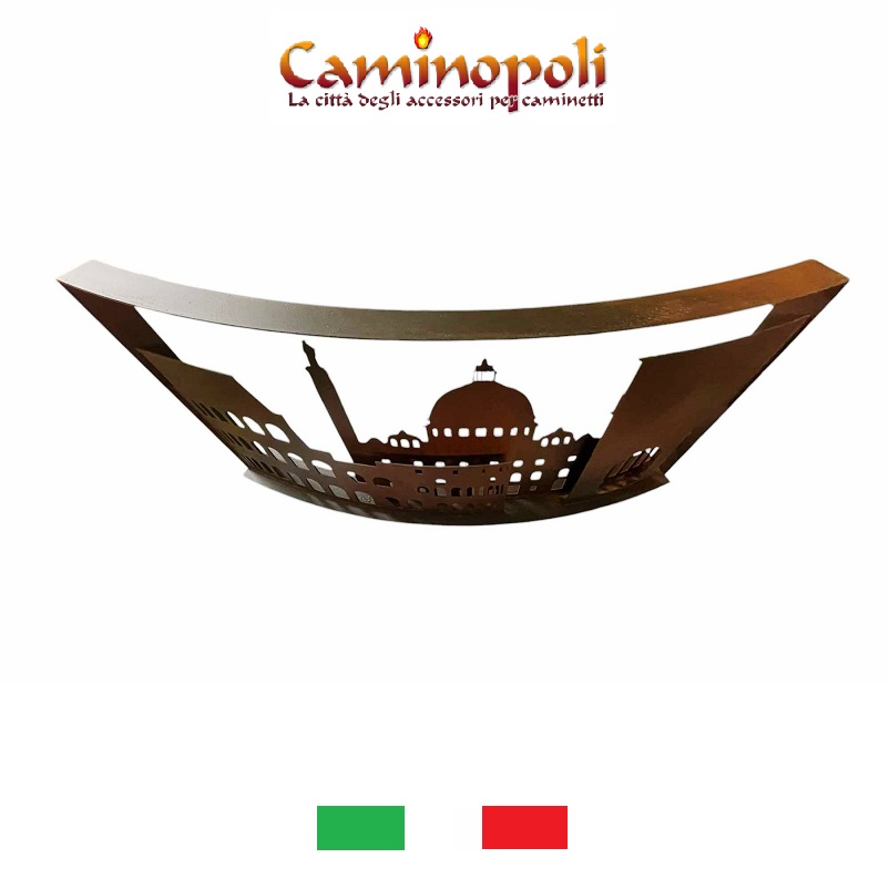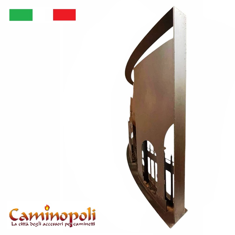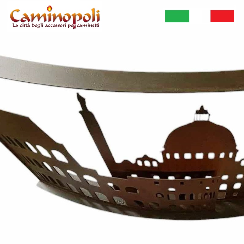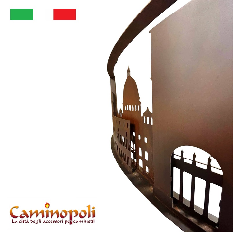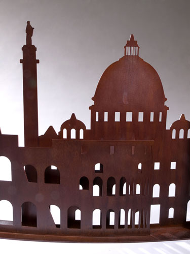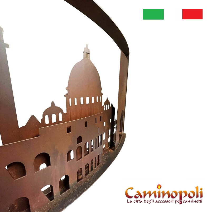 Le nom Roma DCCCXVII fait référence à l’incendie historique dévastateur qui a brûlé la Rome impériale sous le règne de l’empereur Néron en 64 après J.-C. Le pare-feu reconstitue en fait, en acier découpé au laser, la ligne d’horizon de la ville de Rome, reproduisant un jeu d’ombres et de lumières (il faut bien le dire) à l’éclat sinistre.