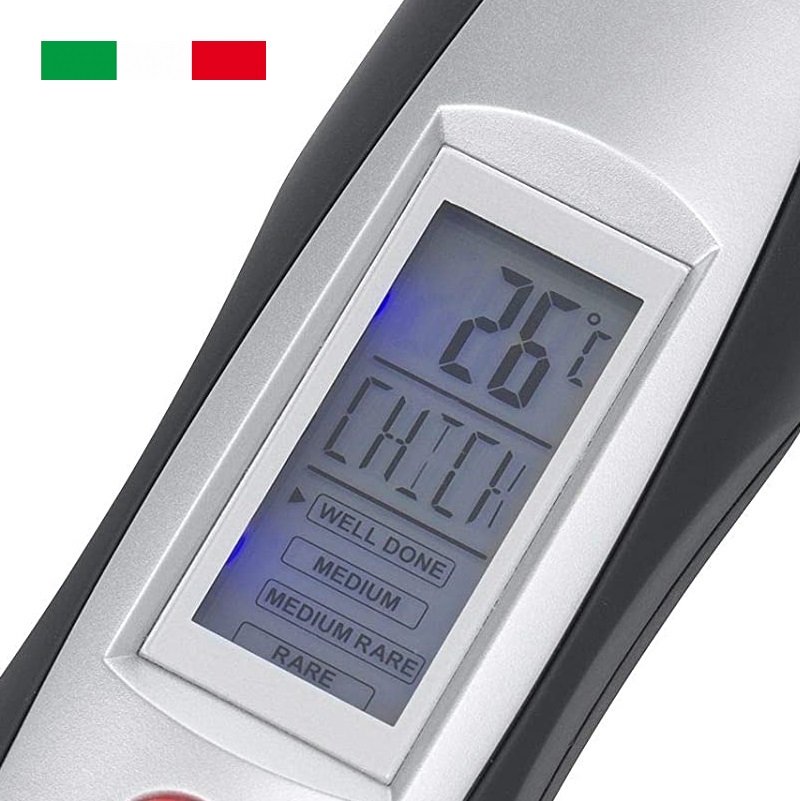 Il peut être programmé et lorsqu’il atteint le degré de cuisson requis, le thermomètre émet un signal sonore.