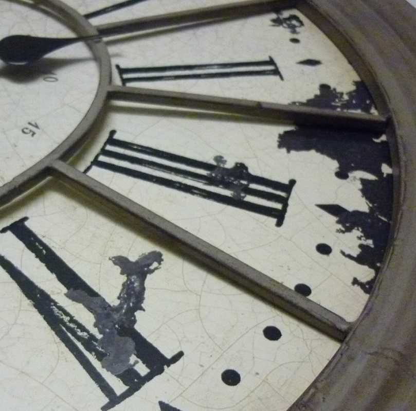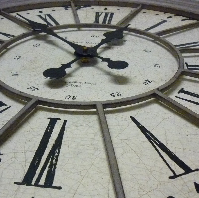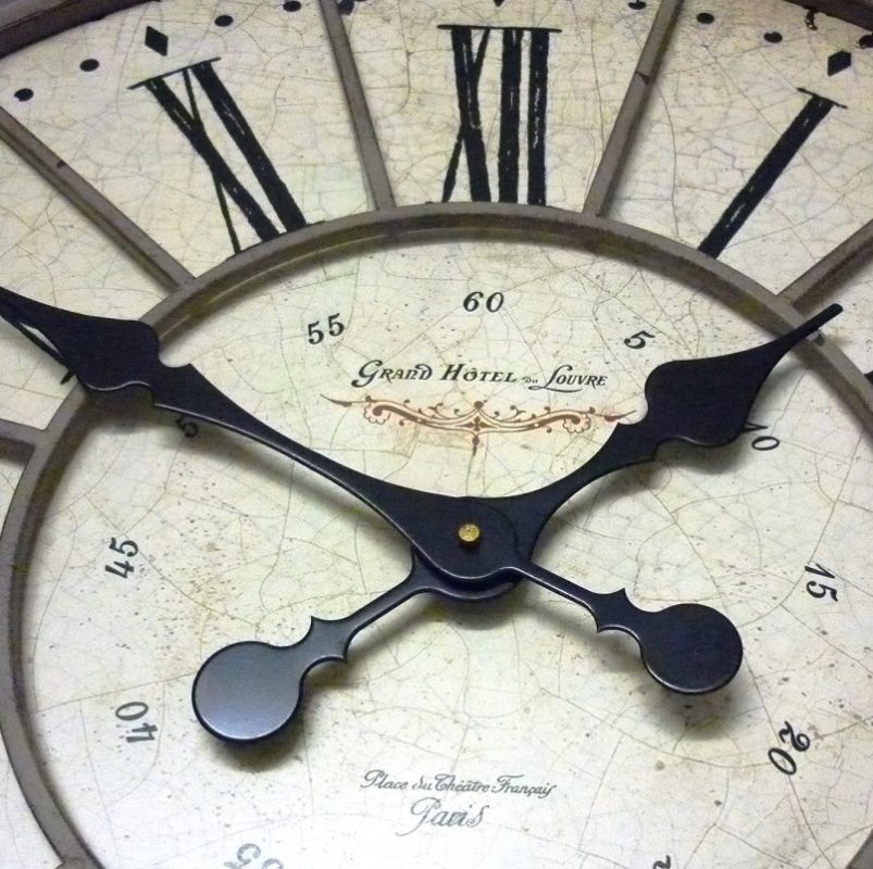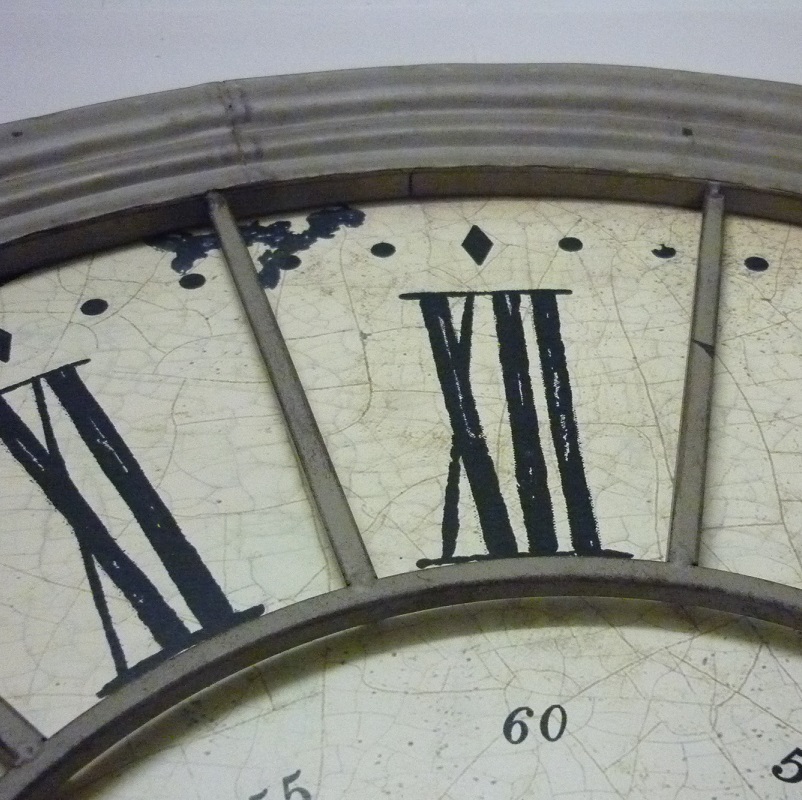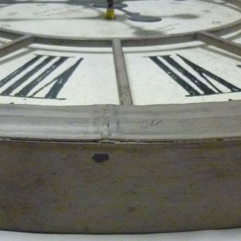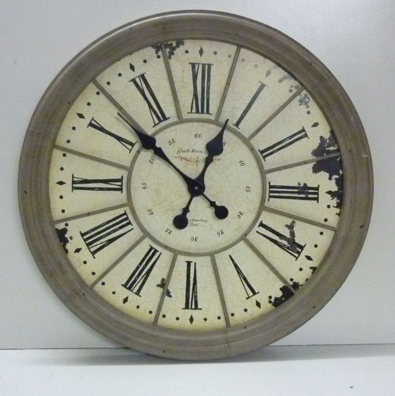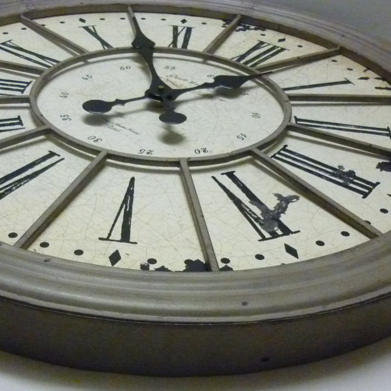Grande horloge murale circulaire ou de cheminée avec un cadre en métal de couleur crème et des chiffres romains.