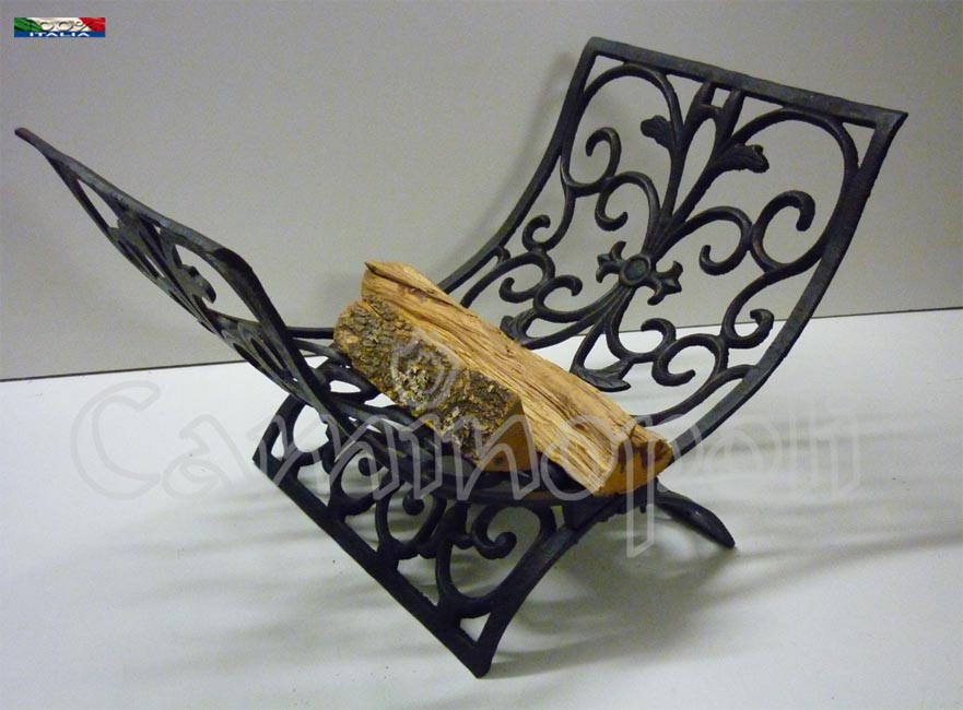 Porte-bois de campagne en fonte, idéal comme porte-revues pendant les mois d’été.