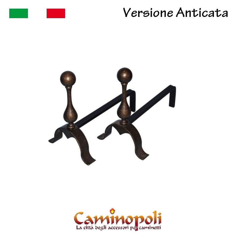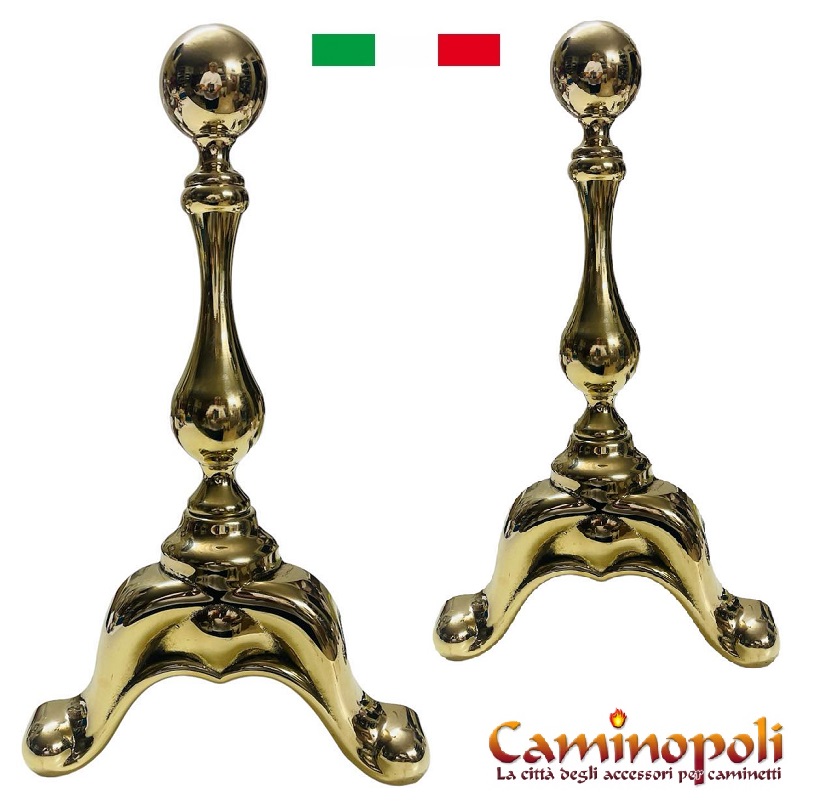 Alari en laiton massif avec sujet en birillo, simple et élégant, proposé en deux finitions, Polished et Antique comme indiqué sur la photo.