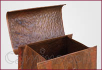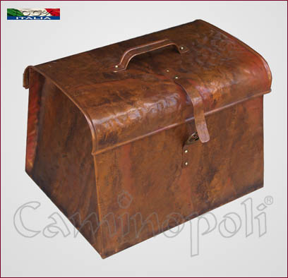 Porte-bois ou pellets en cuivre, semblable à la « trousse du médecin », avec un couvercle qui s’ouvre à l’aide de deux charnières, un récipient pratique capable de cacher même le plus petit bois ou des objets similaires pour la gestion et le nettoyage de la cheminée.
