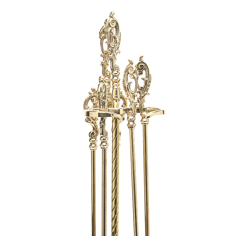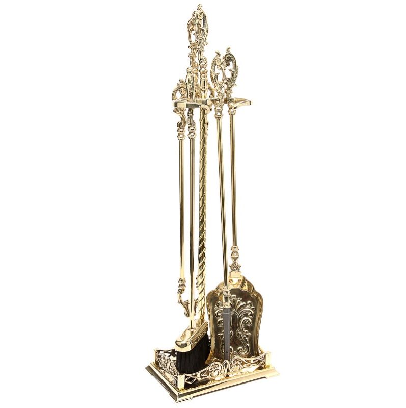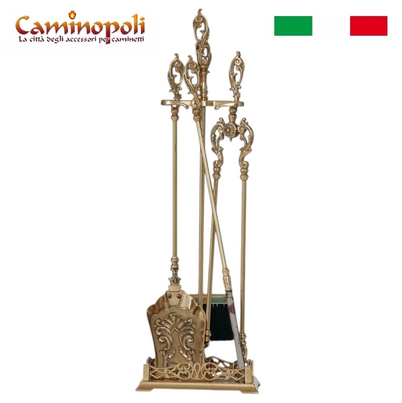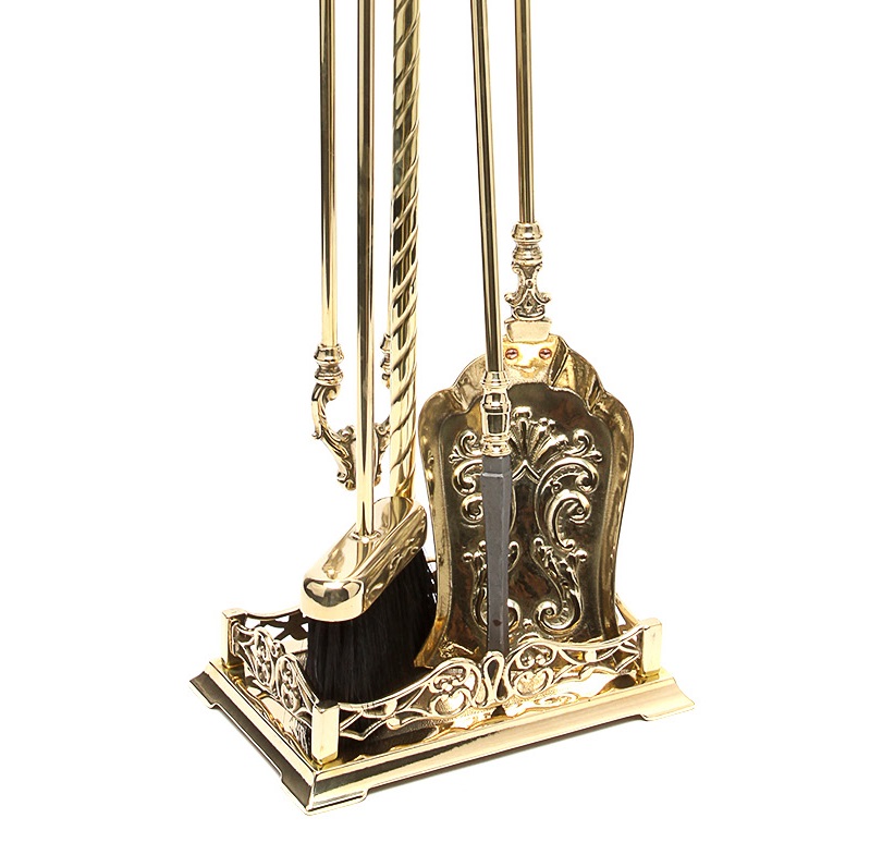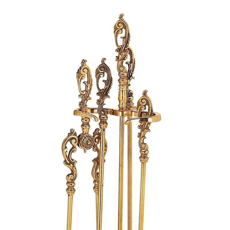 Set d’outils de cheminée en laiton massif, finition polie, composé de 4 accessoires comprenant la pelle, le balai, la pince et l’outil de cheminée. Le perchoir avec sa base rectangulaire sert de cendrier et assure une excellente stabilité.