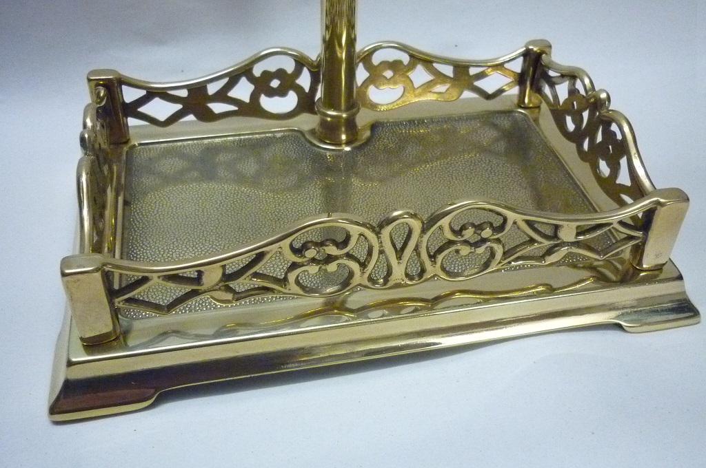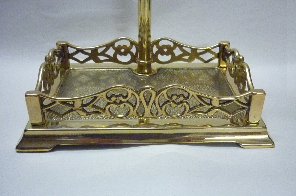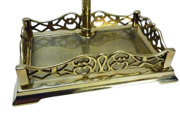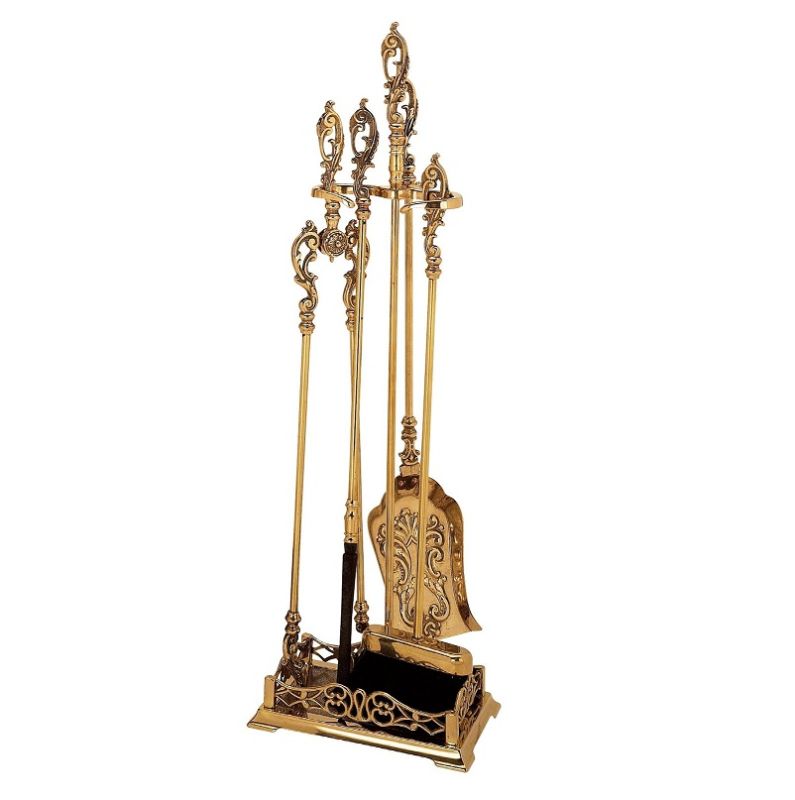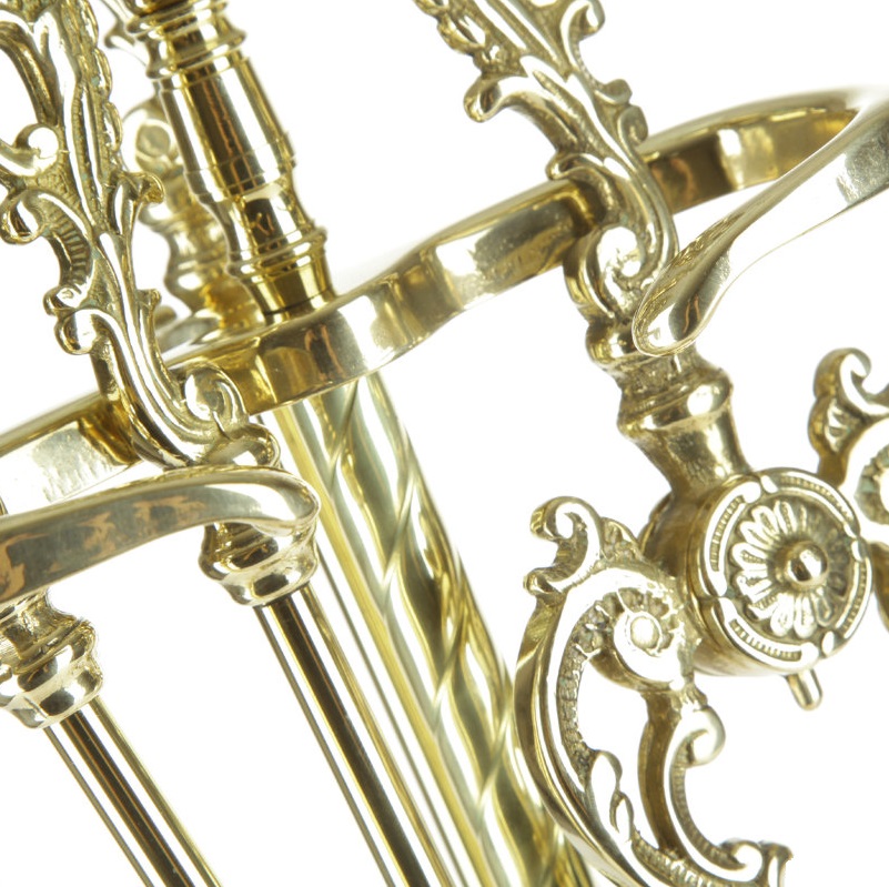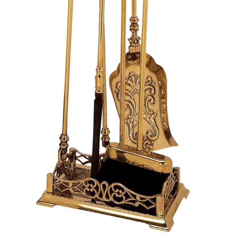 Set d’outils de cheminée en laiton massif, finition polie, composé de 4 accessoires comprenant la pelle, le balai, la pince et l’outil de cheminée. Le perchoir avec sa base rectangulaire sert de cendrier et assure une excellente stabilité.
