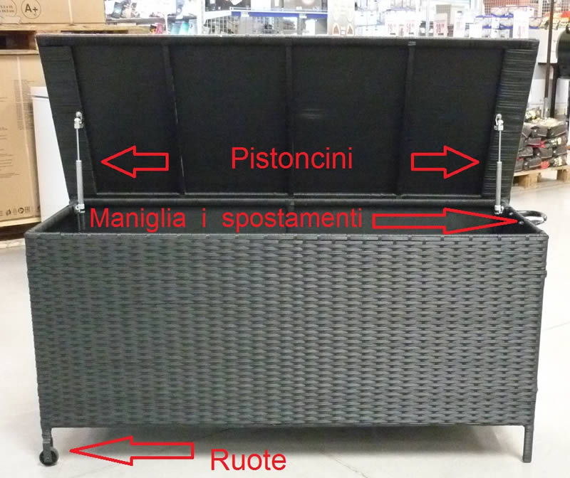 Elegante Baule multiuso e lo proponiamo come portalegna, la sua struttura è in metallo ma la pannellatura è in rattan sintetico di colore nero e quindi Lavabile, il coperchio è assistito da due pistoncini che aiutano a tenerlo aperto, ha la maniglia sul lato destro ed anche le ruote sil lato sinistro per i piccoli spostamentii.