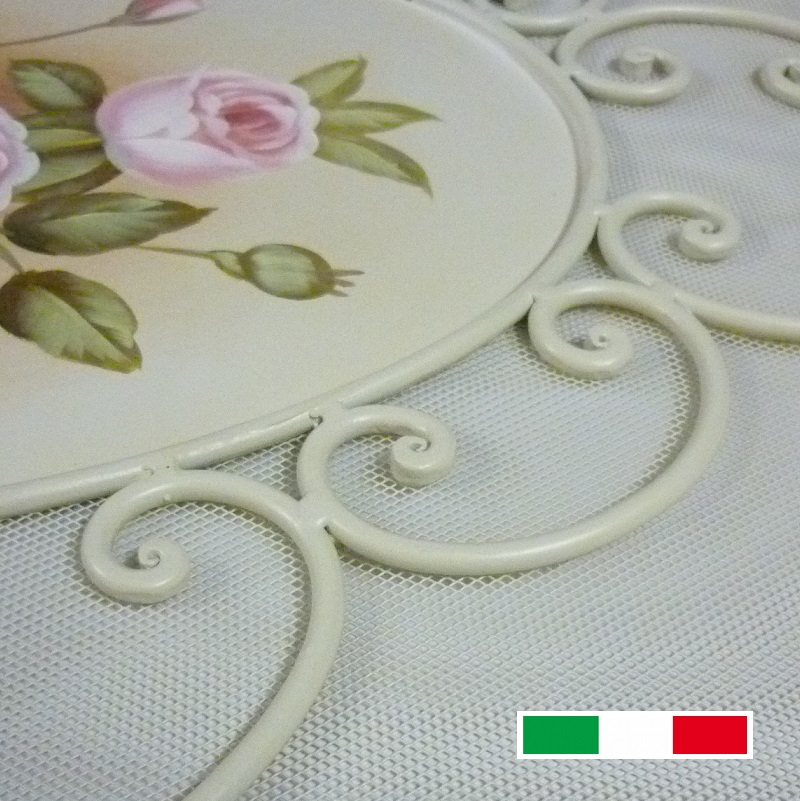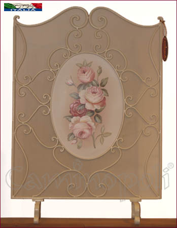 Copricamino o parascintille monopezzo in ferro battuto e forgiato a mano proprio come si faceva nei tempi passati, colore avorio decorato a mano con soggetto floreale.