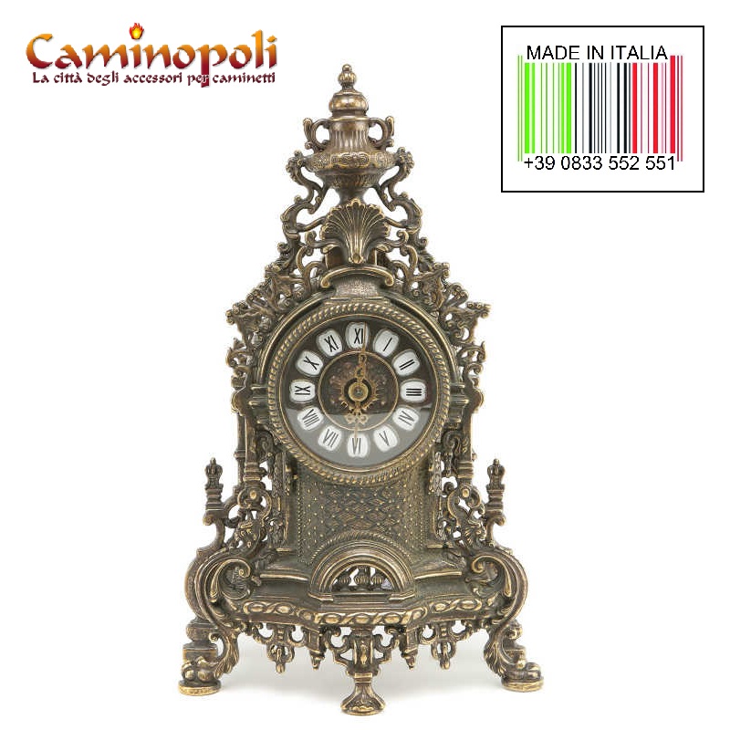 Trittico composto da orologio ed una coppia di candelieri, ogni candelabro ospita 5 candele ed insieme all’orologio che monta oggi movimento al quarzo sono rifiniti fronte/retro, questo significa che posti davanti ad una specchiera si esporranno nella loro massima bellezza, realizzati in massiccio bronzo e proposti nella finitura lucida o Anticata.