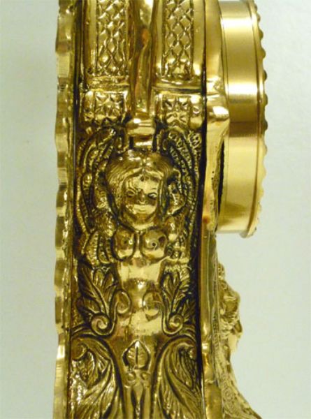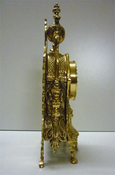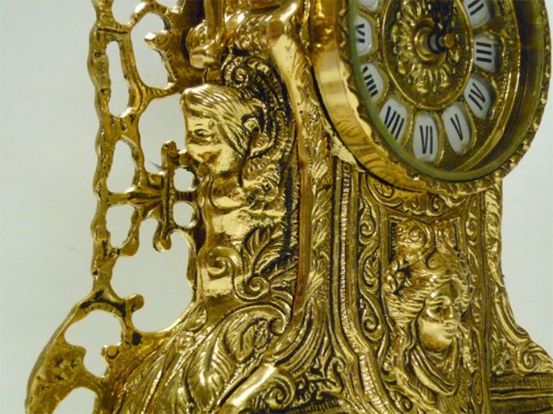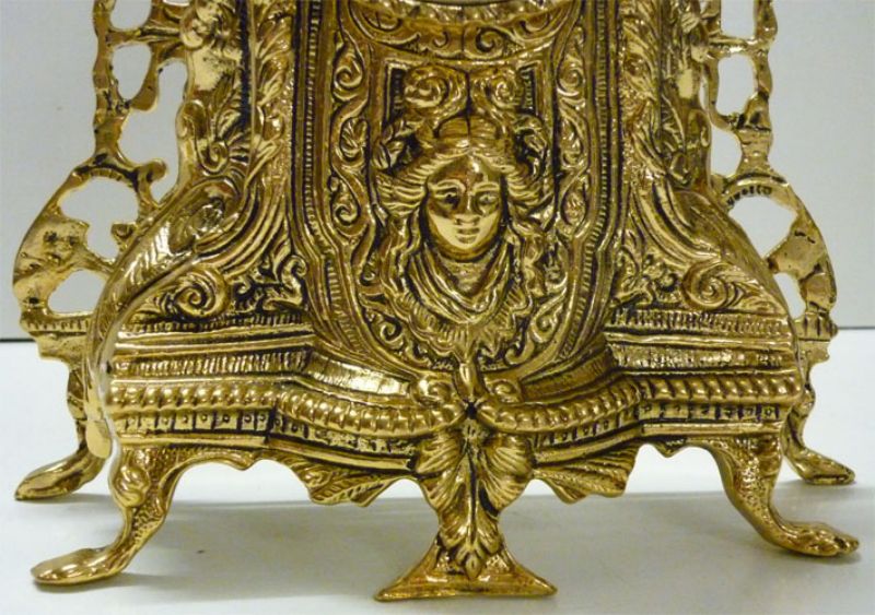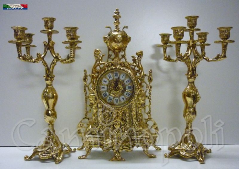 Trittico composto da orologio ed una coppia di candelieri, ogni candelabro ospita 5 candele ed insieme all’orologio che monta oggi movimento al quarzo sono rifiniti fronte/retro, questo significa che posti davanti ad una specchiera si esporranno nella loro massima bellezza, realizzati in massiccio bronzo e proposti nella finitura lucida.