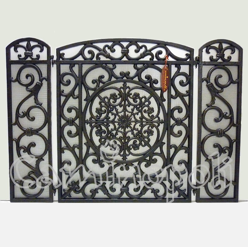 Parascintille in ghisa, pannello centrale con decoro rosone e due ante laterali che serviranno a circoscrivere il fuoco e regalare decoro anche a chi siede a lato del camino.