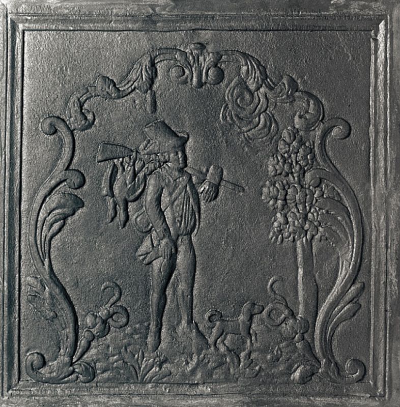 Piastra in ghisa da camino raffigurante un momento di caccia, il Cacciatore solitario.