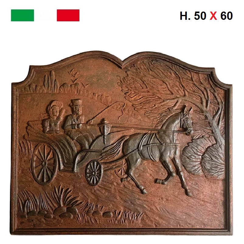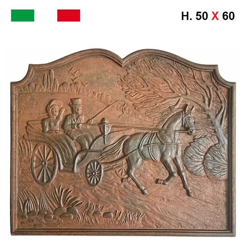 Piastra in ghisa, soggetto carrozza con cavallo.