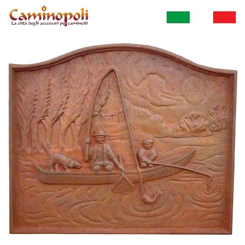 Piastra in ghisa per il camino raffigurante un momento della pesca.