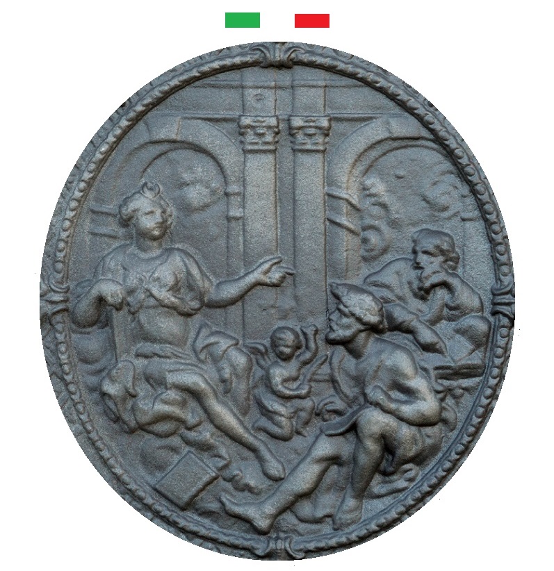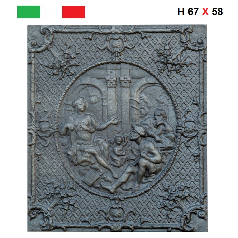 Piastra in Ghisa che decora, protegge e riflette il Calore del Camino nella stanza.