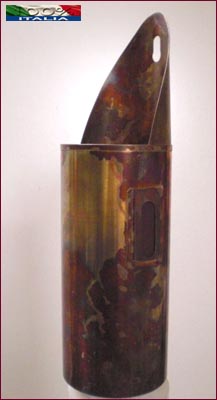 Portafiammiferi e porta accendifuoco realizzato in rame ossidato, con tasca portagrattino per una facile accenzione, puo essere posato o appeso.