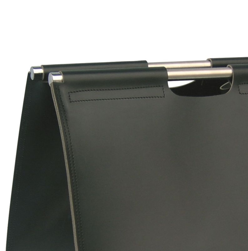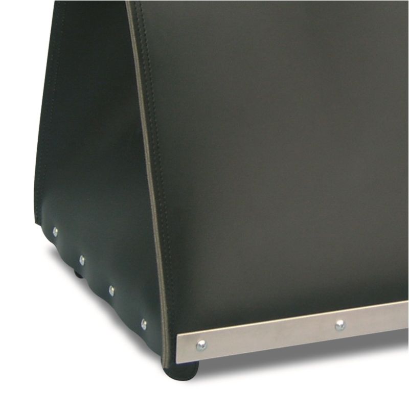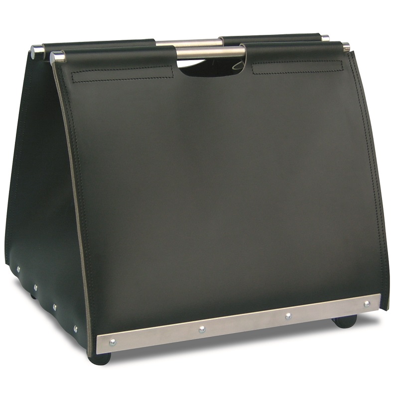 Portalegna in Cuoio nero cucito, dettagli in Acciaio spazzolato con ruote per i piccoli spostamenti in casa.