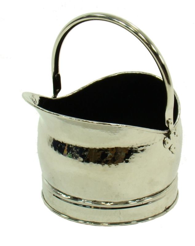 Secchio carbone con manico, realizzato in ottone e nichelato (finitura argento), ideale per tenere pronta la legna, la legna più piccola per l’accenzione, accendifuoco,fiammiferi o magari con una composizione di fiori secchi per ornare la bocca nei mesi estivi.