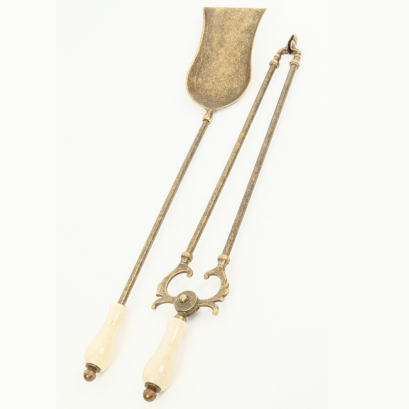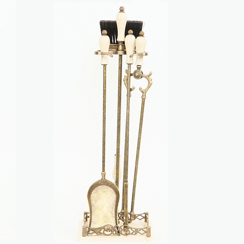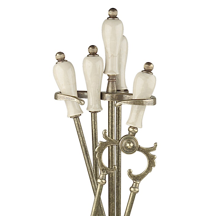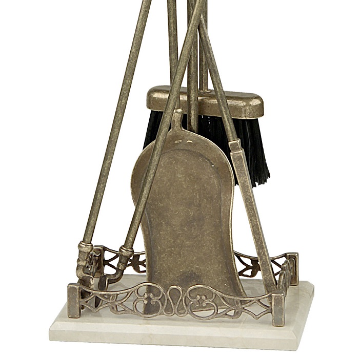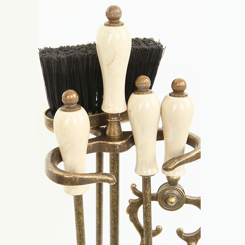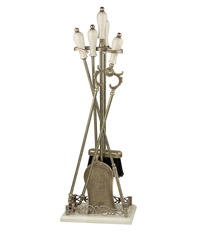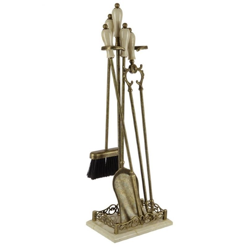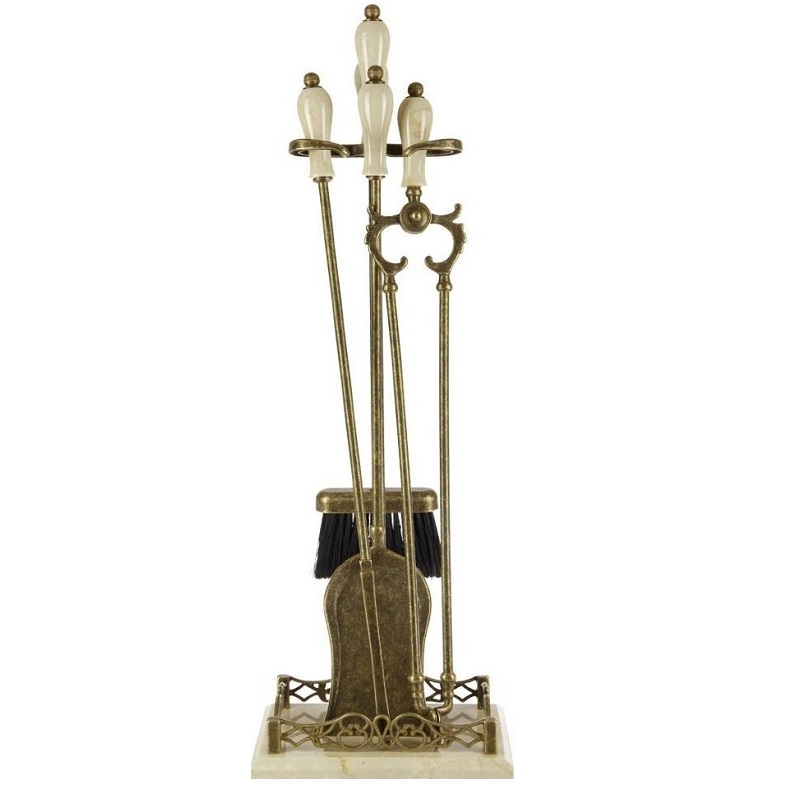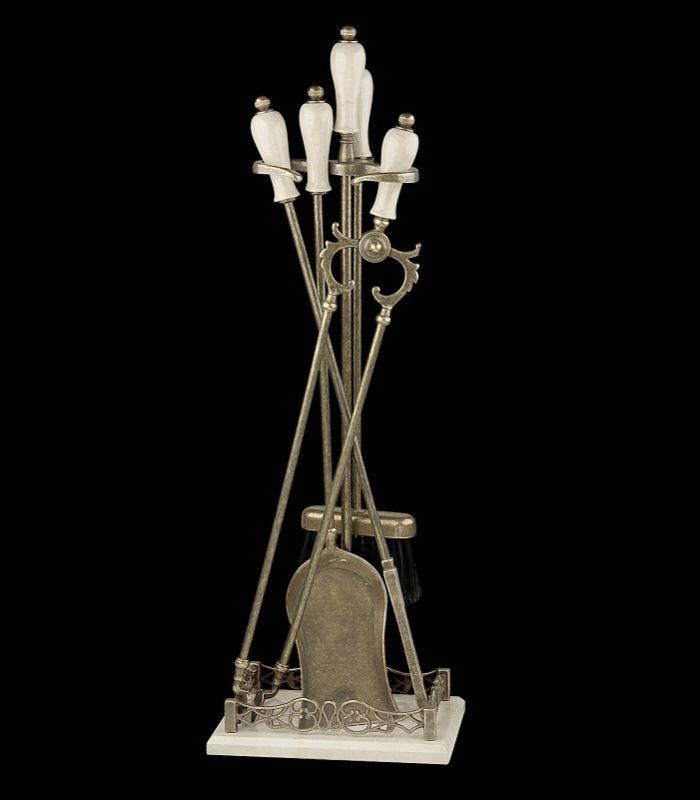 Set di accessori per il Camino realizzati in ottone e proposto nella finitura invecchiata con l’inserimento di alcuni dettagli come Base ed impugnature in MARMO chiaro.