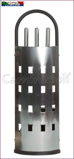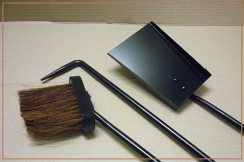 Set di attrezzi per il camino con maschera in acciaio lucido, composto 3+1 con Scopino, Paletta ed Attizzatoio, impugnature in acciaio massiccio.
