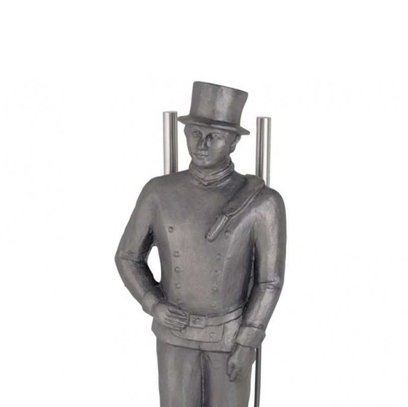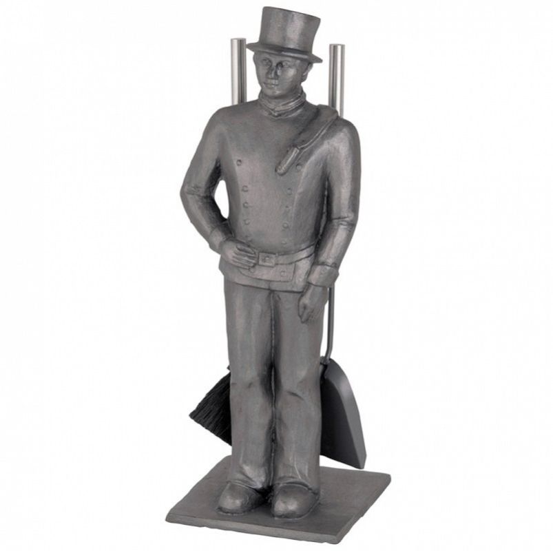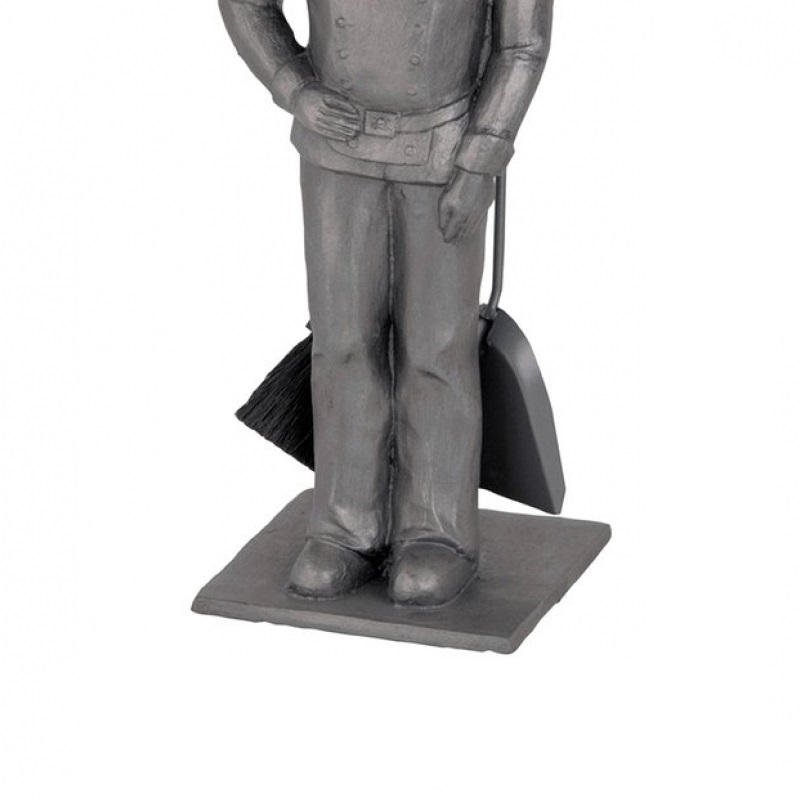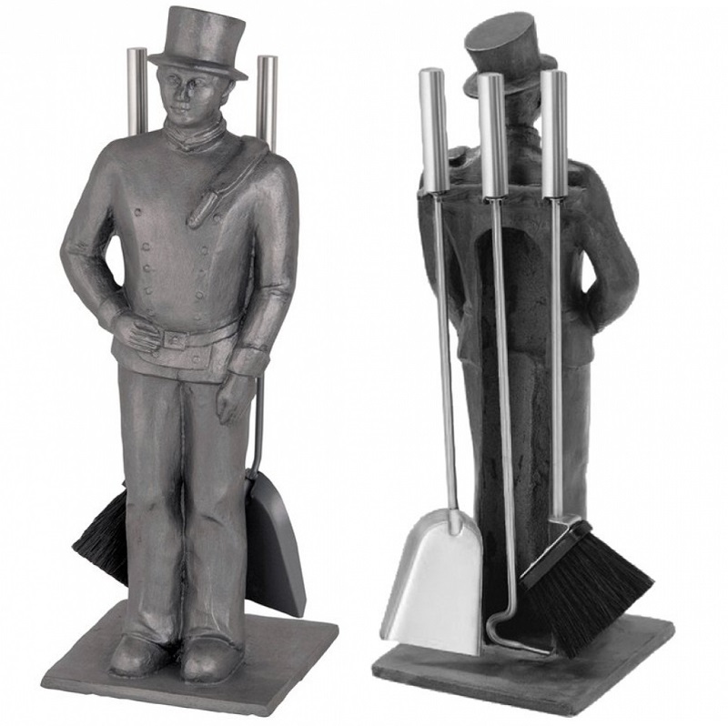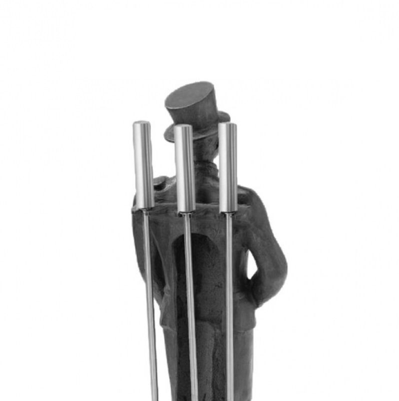 Simpatico porta-attrezzi rappresentante la figura dello Spazzacamino, realizzata in alluminio pieno, verniciato in grigio opaco, ottimo complemento capace di presiedere la bocca del camino in qualunque ambiente, 3+1 con paletta, scopino e attizzatoio, realizzati in ferro con impugnatura in acciaio.