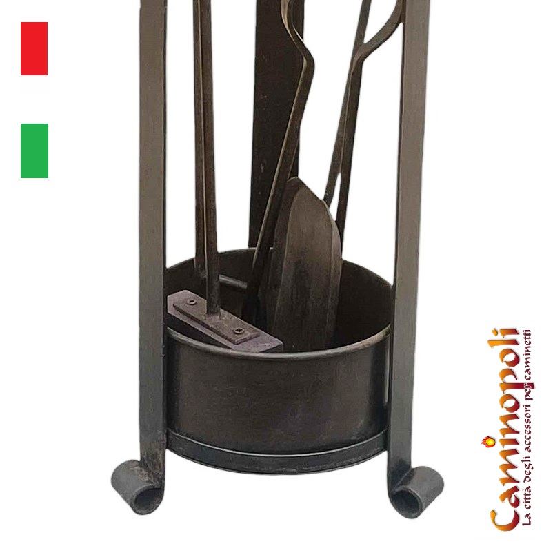 Set di attrezzi 4+1 pezzi in ferro forgiato con impugnature in legno di colore nero.