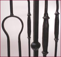 Set di attrezzi per il camino 4+1 realizzato in ferro forgiato e battuto interamente a mano da sapienti artigiani Salentini, pratico ed essenziale, composto da paletta, scopino, attizzatoio e pinza con setole in filo d’acciaio.