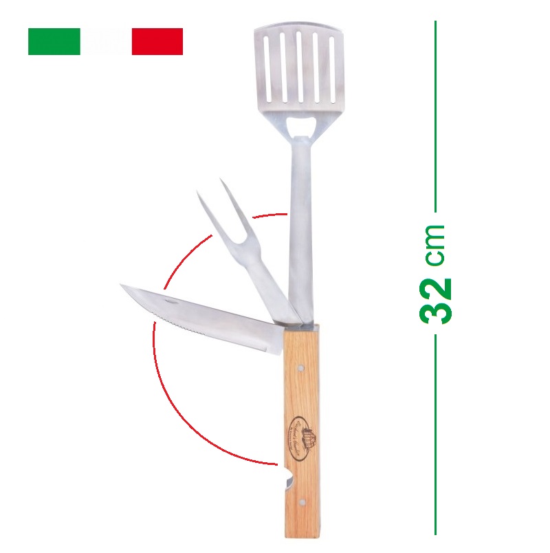 Un comodo strumento che racchiude tre validi aiuti per chi ama il barbecue: Paletta, Forchettone e Coltello.